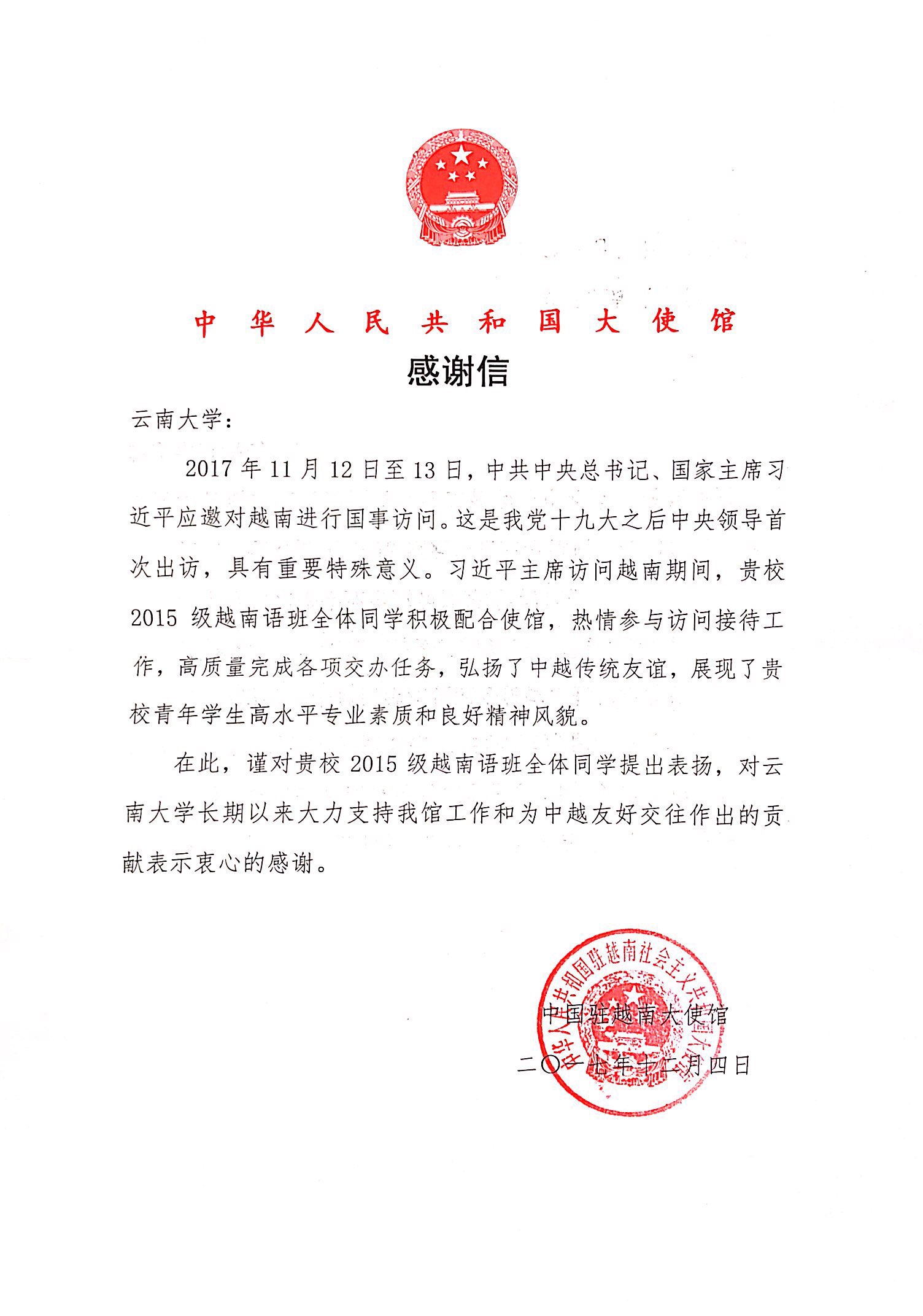 二零一七年十二月四日中国驻越南大使馆向宝威体育官网首页发来一封感谢信,信中提到二零一七年十一月十二日到十三日期间,中共中央总书记、国家主席习近平应邀对越南进行国事访问。这是我党十九大之后中央领导首次出访,具有重要特殊意义。习近平主席访问越南期间,我校宝威体育官网首页2015级越南语班全体同学积极配合使馆,热情参与访问接待工作,高质量完成各项交办任务,弘扬了中越传统友谊,展现了贵校青年学生高水平专业素质和良好的精神风貌。