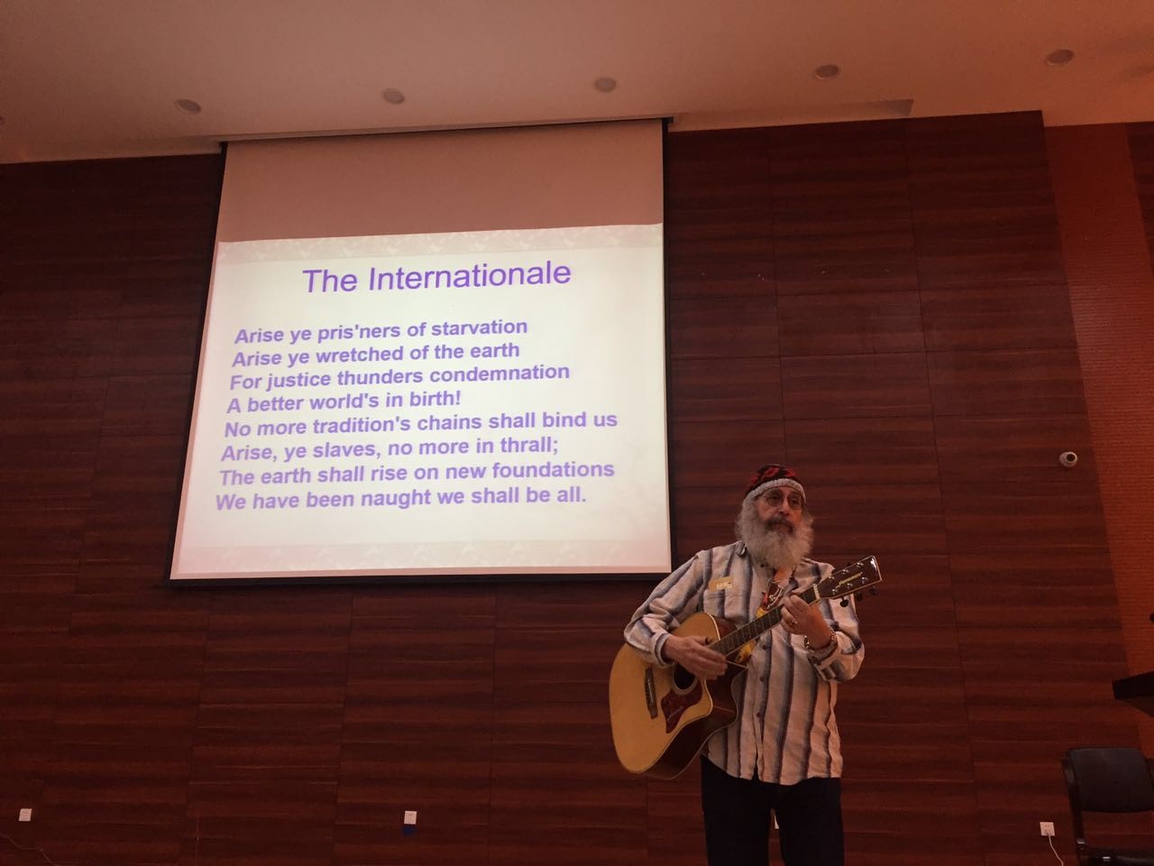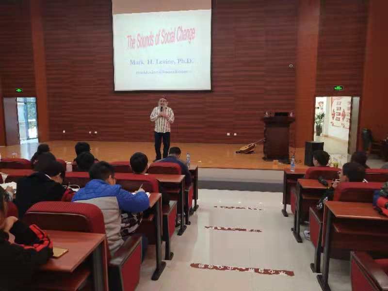 应云南省外专局、宝威体育官网首页国际交流处和宝威体育官网首页的邀请,现执教于中央民族大学的美国专家马克·力文博士(Dr. Mark Levine)于2018年11月30日(周五)上午10:00-12:00在宝威体育官网首页呈贡校区宝威体育官网首页一楼报告厅举行学术讲座。讲座的题目为U.S. History/Culture: The Sounds of Social Change(美国历史/文化:社会变革之声),讲述音乐在美国历史上的政治、社会运动中的作用,涉及废奴运动;大萧条时期美国工人运动;民权运动与反越战运动等。马克·力文博士在讲座中穿插着吉他弹奏,歌曲演唱,将音乐与政治、社会运动的紧密联系呈现给听众。演讲之余,马克·力文博士与学生听众进行互动。报告厅座无虚席,整个场面气氛较好,收到良好效果。