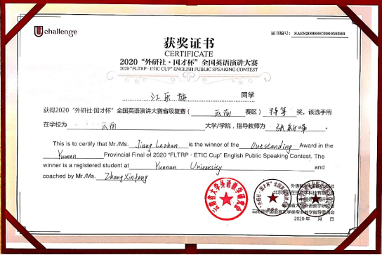 英语系江乐旃同学荣获“外研社·国才杯”全国英语演讲大赛云南赛区特等奖