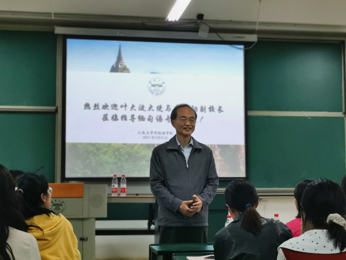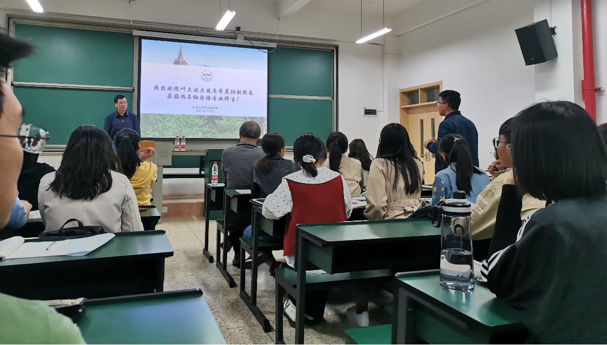 叶大波大使与李晨阳副校长为缅甸语专业师生讲学