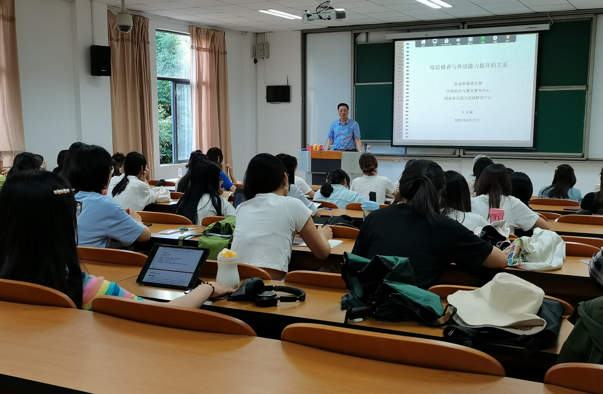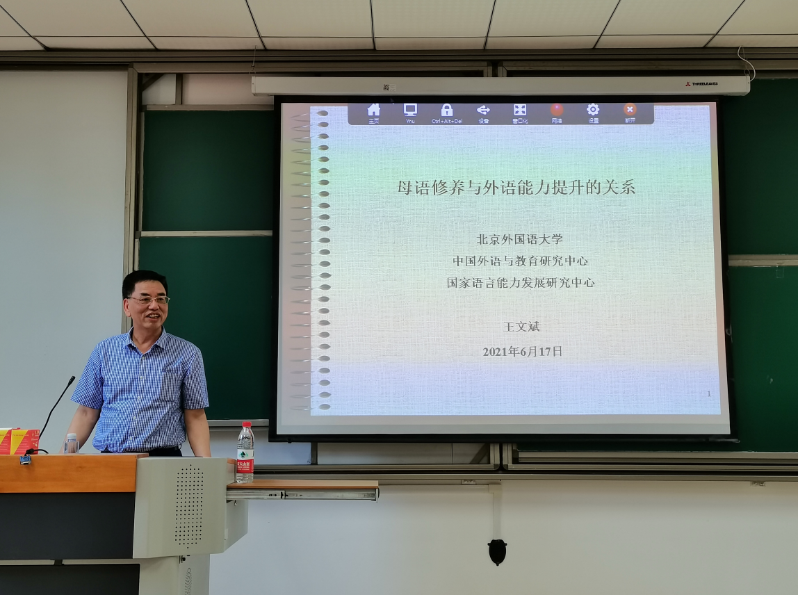 北京外国语大学博士生导师王文斌教授受宝威官网邀请, 6月17日下午莅临宝威官网讲学,举办了专场学术讲座。王文斌教授讲座的题目是《母语修养与外语能力提升的关系》。王教授认为,对于外国语言文学专业的学生而言,外语修养本质上是语言修养,而语言修养与母语修养紧密关联。学习外语,不能仅以外语为唯一目标,而是需要拓展视野,采取行之有效的方法掘深对母语的认知,提升元语言意识。古今中外,成功的外语学习者或研究者无不如此。母语修养水平最终将是外语水平的天花板,也是外语能力发展的关键。