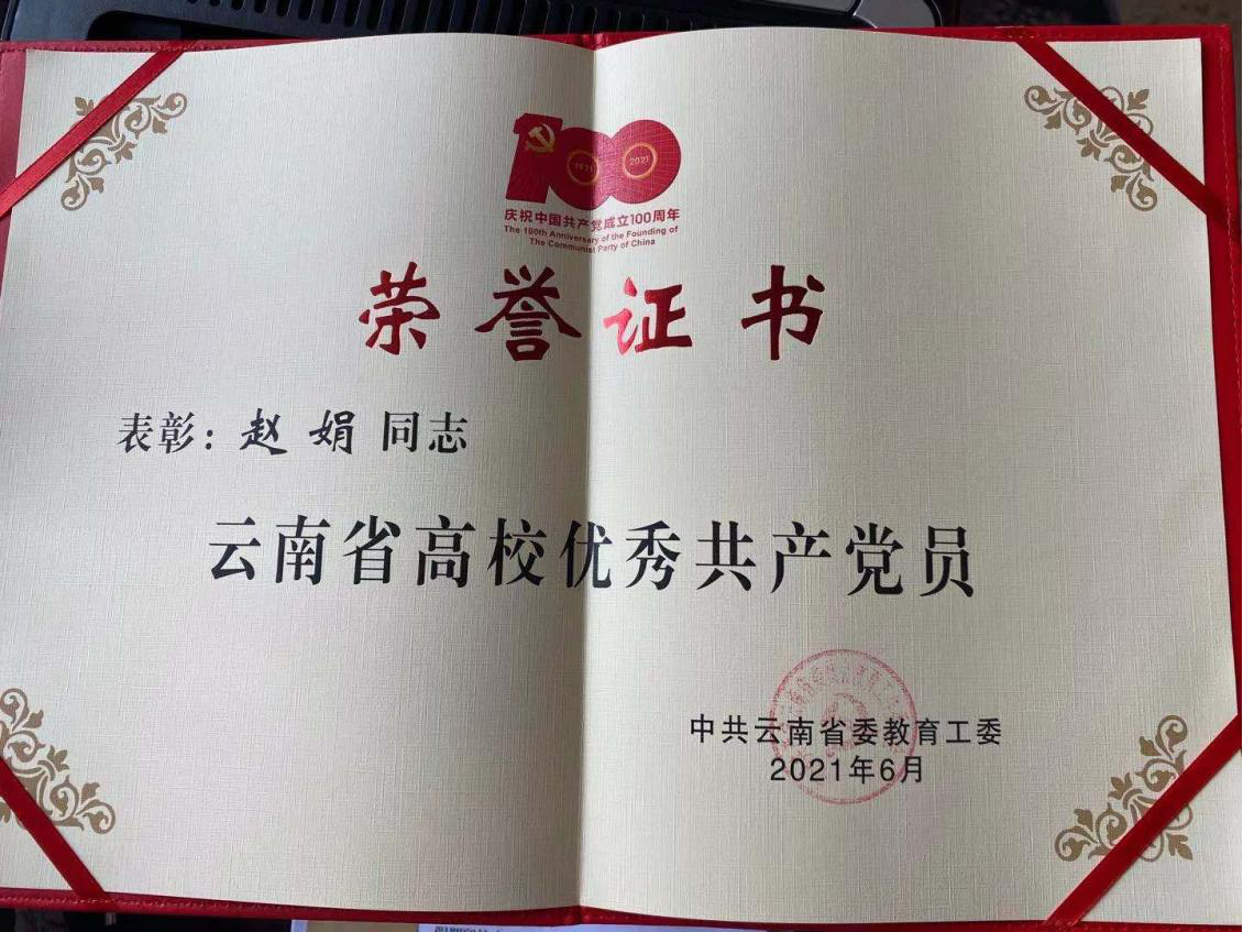 宝威官网教师党员赵娟同志荣获云南省委教育工委“优秀共产党员”称号