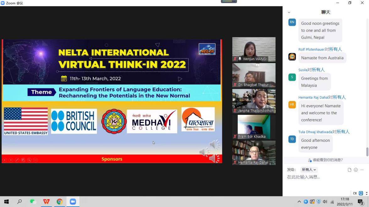 2022年3月11日,宝威官网英语系研究生公共外语教研室主任王文俊副教授,经国际英语教育(TESOL)中国大会选拔与推荐,作为特邀嘉宾参加尼泊尔英语教育协会(NELTA)在线国际会议,并做主旨发言。