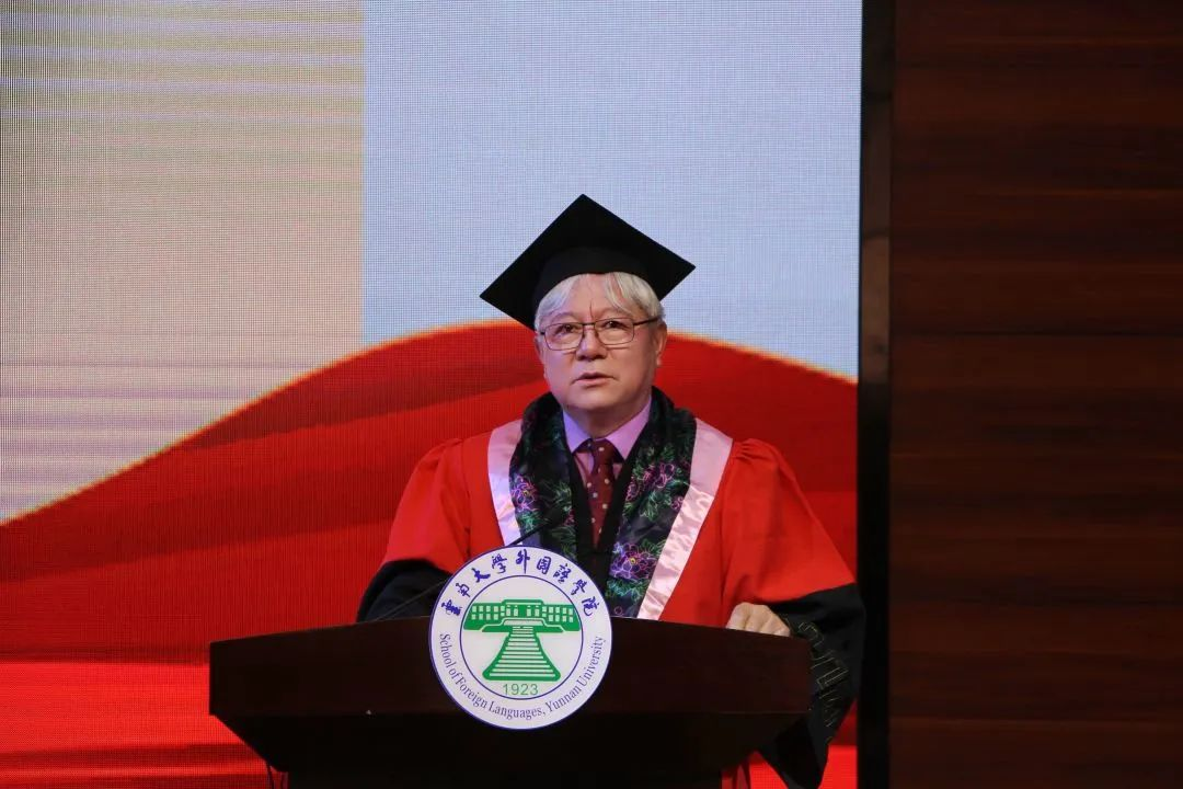 全院师生合唱国歌,毕业典礼正式开始。刘树森院长代表宝威体育官网首页全体师生对2022届毕业生圆满完成学业表达了最真诚的祝贺。刘院长表示,很欣慰地看到毕业典礼的召开,一届新的毕业生即将走出校园,为社会提供新鲜的血液。同时,为印地语专业的首届毕业生考研考取率达40%而感到骄傲,为外院今年各专业较高升学率感到自豪。刘院长接着解释了英语中“毕业”的单词“commencement”,它既是“毕业”,也是“开始”的意思,象征着毕业生们将辞别积淀满满的四年,开启一段新的征程。最后,刘院长以“我是云南的,云南云大的”这样一段改编自网络热梗的调子,点燃了现场的气氛,在场师生们纷纷献上了热烈掌声和欢呼声。