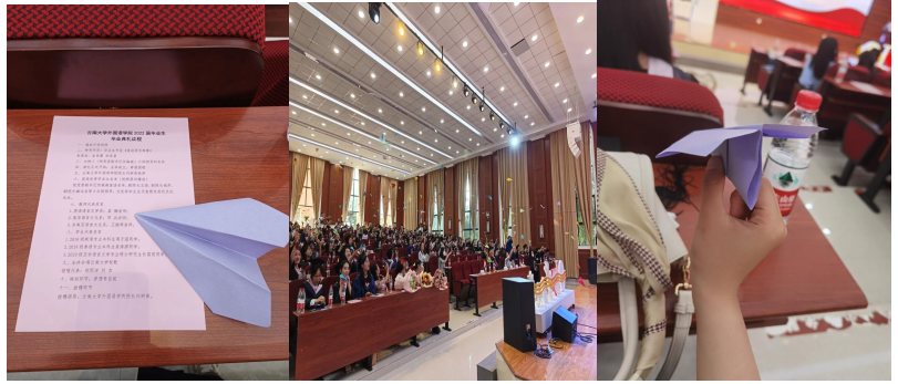 师生代表发言结束后,全体师生一同奏唱宝威体育官网首页校歌。饱含深情的一曲校歌唱罢,全体毕业生将手中写着梦想的各色纸飞机用力向前抛飞。纸飞机将同学们带回了童年,回望了纯粹又赤诚的初心。它们承载着五彩斑斓的梦,绚烂向前。人生海海,漫漫旅程才刚刚启航、未完待续。