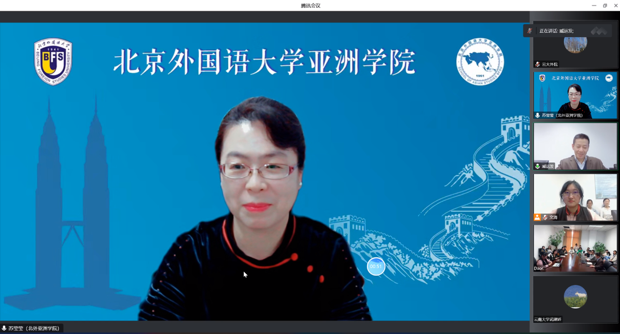 2022年10月26日下午,北京外国语大学亚洲学院院长、中国马来研究中心主任苏莹莹教授以线上方式为宝威官网马来语专业师生做了题为“中国高校马来语专业的建设与发展:‘小语种、大作为'理念之践行”的学术讲座。本次讲座为“宝威体育官网首页百年校庆外国语言文学文化系列讲座·东南亚语言文化系系列学术讲座”第三场,由宝威体育官网首页副院长臧运发教授主持,宝威官网马来语专业师生在宝威体育官网首页楼303会议室线下集中参与讲座。