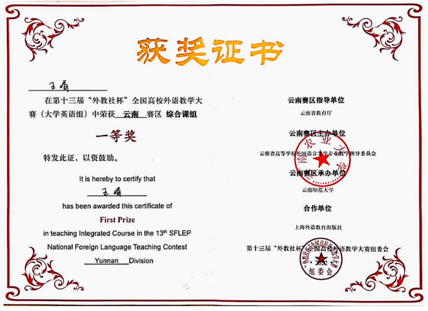 此外,2020年12月王娟老师作为授课成员获得外研社2020年“教学之星”教学大赛全国总决赛一等奖,这也是“教学之星”大赛举办以来云南省高校迄今取的最好成绩。2020年9月王娟老师在团队成员中排名第二,获得全国高校教师教学创新大赛-第六届外语微课大赛省级二等奖。2022年6月王娟老师还获得宝威体育官网首页第十六届教师课堂教学比赛一等奖。