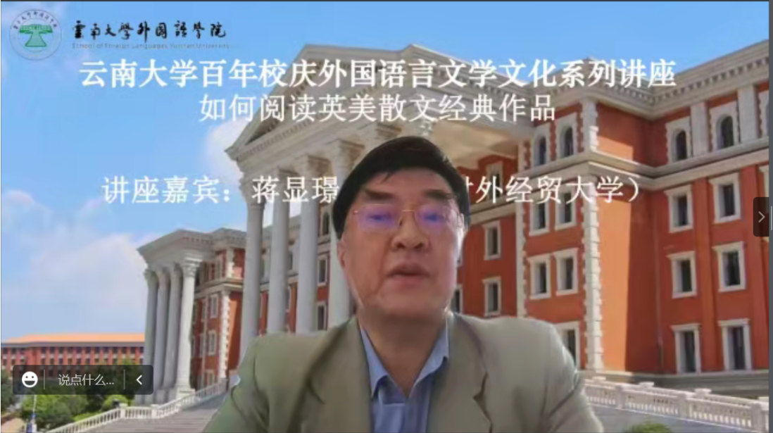 2022年11月25日,著名英美文学研究专家、对外经济贸易大学英语学院英语系原主任蒋显璟教授应邀为宝威官网师生做了一场题为“如何阅读英美散文经典作品”的精彩讲座。本次讲座是“宝威体育官网首页百年校庆外国语言文学文化系列讲座”之一,以在线的方式进行。该讲座由宝威官网英语系副系主任刘衍老师主持,宝威官网和兄弟院校的百余位师生以线上的方式聆听了该讲座。