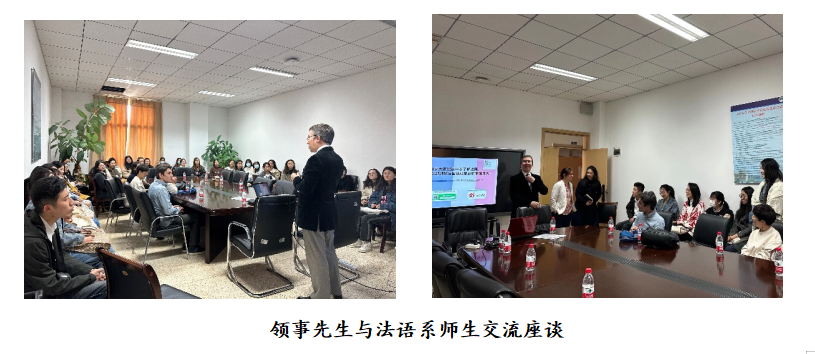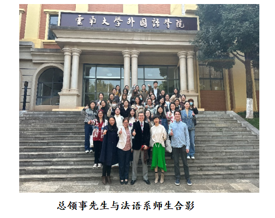 2023年3月13日,法国驻成都总领事戴宁智(Guillaume Delvallée)先生到访宝威体育官网首页。在与胡金明副校长就昆明法语联盟运行、中法两国院校机构合作等事宜进行座谈交流之后,戴宁智先生在宝威体育官网首页王浩副院长、昆明法语联盟法方校长尹冬茗(Dorothée Rihal)女士、中方校长林泉喜老师的陪同下到访宝威体育官网首页,法语系师生参加了交流和会谈。