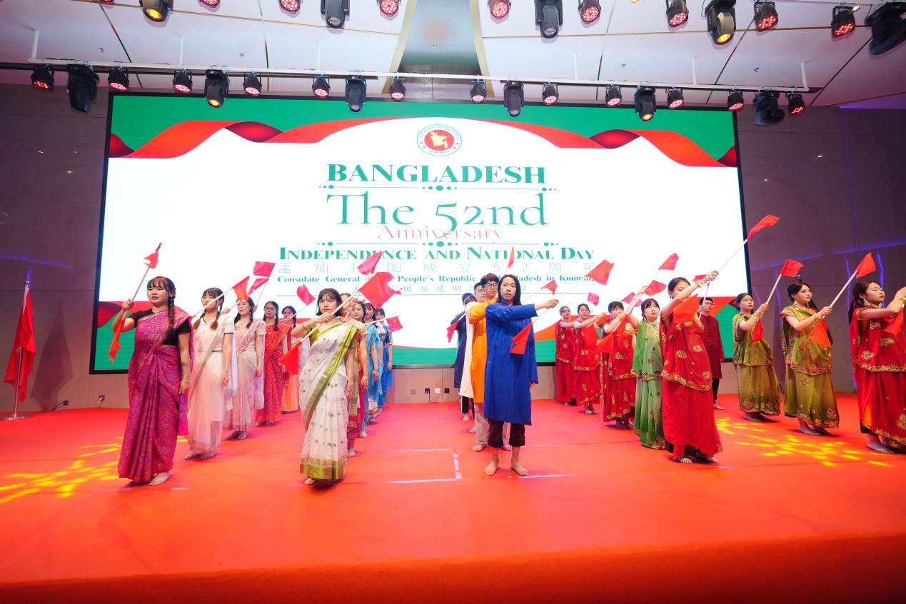 仪式结束后,外院师生带来了精心准备的表演,用舞蹈、歌唱和诗歌等多个节目表达了对孟加拉文化的尊敬和热爱,为孟加拉国52周年独立日活动线上了真挚的的祝福,精彩的演出受到了孟加拉国驻昆明总领事馆的热情欢迎。