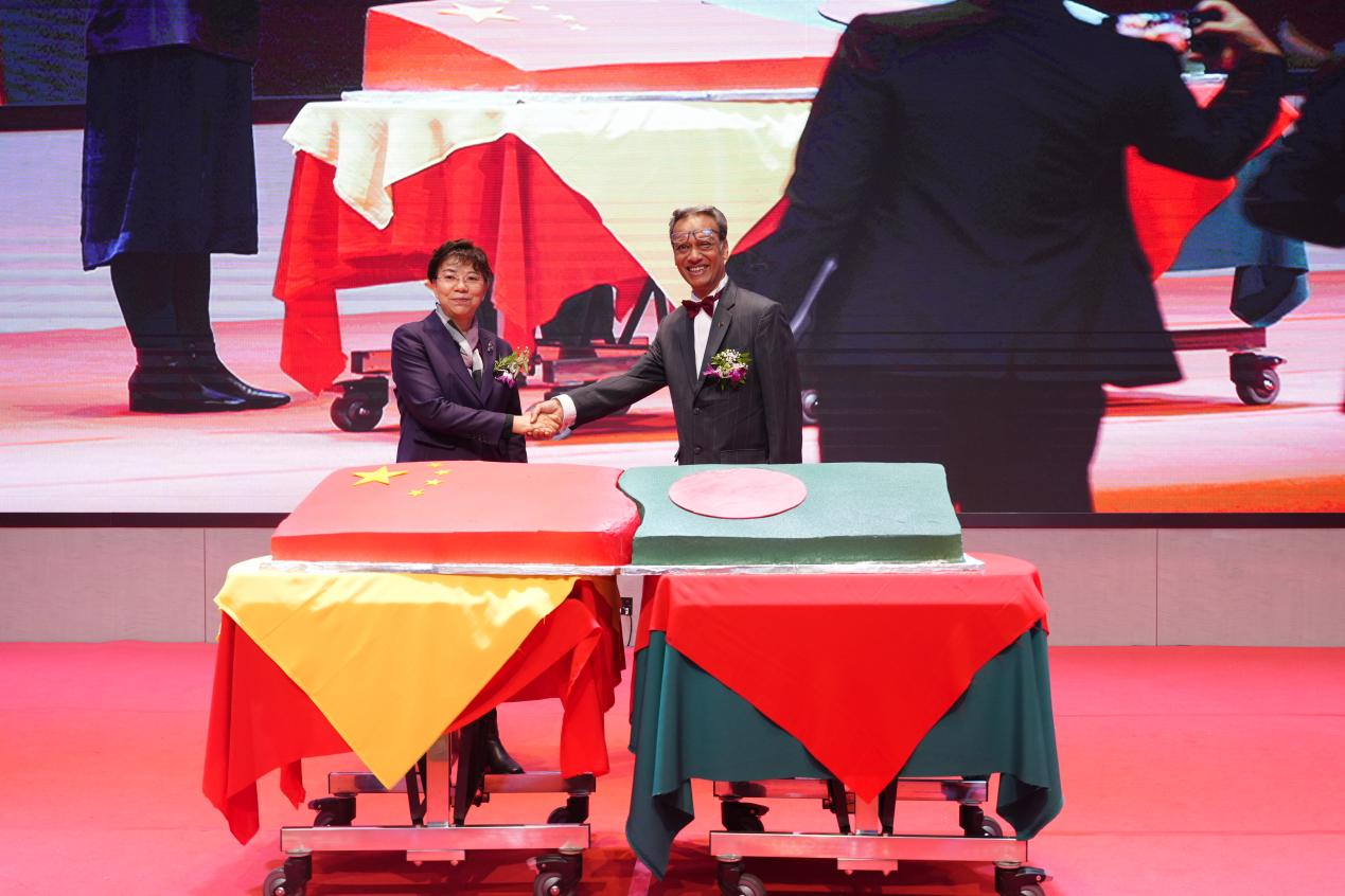 国歌奏毕,在总领事的带领下全场来宾向在孟加拉国独立战争中牺牲的烈士们默哀,默哀后总领事进行了致词。致词毕,总领事邀请省人大常委会副主任王树芬上台进行了蛋糕合并仪式。