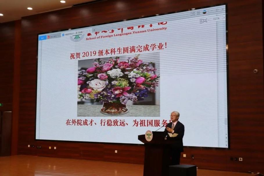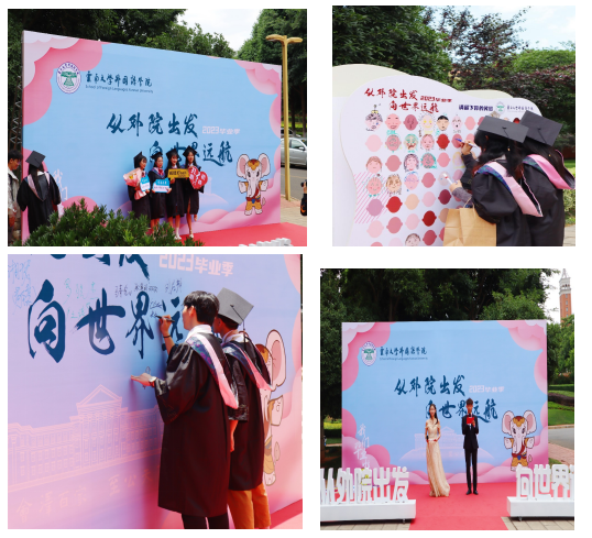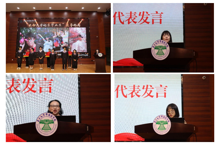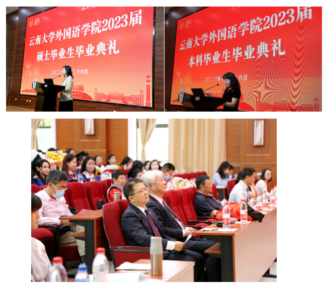 在硕士生毕业典礼上,学院党委副书记何淼淼宣读优秀硕士毕业生名单,由副院长王浩、谢萍、臧运发三位领导,为优秀毕业生代表颁发奖状及纪念品。随后,英语语言文学系刘衍老师、日语语言文学系郑雁天老师、东南亚语言文化系于在照老师作为教师代表依次发言,表达了对同学们的真挚祝福。刘衍老师回忆了过往三年,同学们从青涩懵懂变得更加成熟稳重,以情深意切的语言表达了对2023届硕士毕业生的美好祝愿。郑雁天老师用自己的研究生经历,以学姐的身份给予同学们真诚建议。于在照老师用“祝贺”“互勉”“祝愿”六个字,教导同学们要永跟党走,报效祖国;不断学习,完善自我;奋勇攀登,不懈努力;最后,祝愿同学们秉承“会泽百家,至公天下”的云大精神,从外院出发,展翅高飞,鹏程万里。