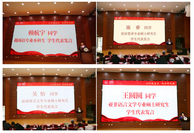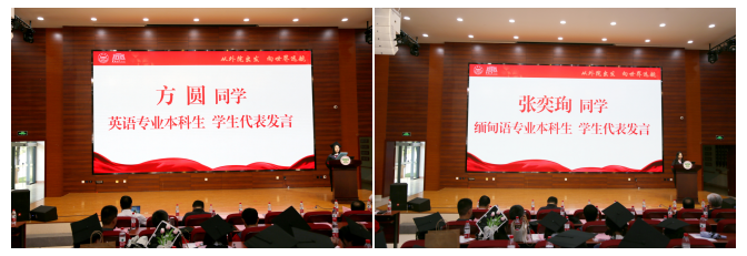 教师代表发言后,2019级英语专业本科生方圆、2019级缅甸语专业本科生张奕珣、2019级越南语专业本科生赖航宇作为本科生代表,2020级英语笔译专业硕士研究生施睿、2020级法语语言文学专业硕士研究生吴仪、2020级亚非语言文学专业硕士研究生王圆圆作为硕士生代表依次上台发言。六位同学分享了在宝威体育官网首页期间的收获与成长,表达了内心的不舍和对未来的期待,为毕业生们送上祝福。