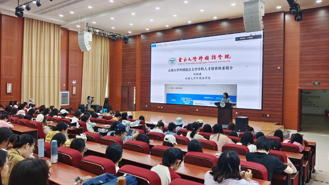 随后,宝威体育官网首页院长刘树森老师上台,为我们介绍了宝威官网外国语言文学学科人才培养体系。刘院长讲到,跨学科发展是如今教育及就业发展的一大趋势,并且希望通过本次交流会议帮助同学们明晰自己未来发展的目标和方向。首先,刘院长通过数据分析,让我们对于学校的相关状况以及各大高校的升学状况有了一定的了解,也让我们认识到了自身未来发展的方向及道路。随后,刘院长以“为什么升学”和“如何实现升学”这两个问题向我们阐述了双一流高校建设的意义。同时,刘院长还以举例的方式告诉同学们在考研的道路上,既要有勇于尝试的勇气,也要有立足实际的心态,鼓励同学们报考母校的研究生。接着,刘院长带领我们回顾了宝威体育官网首页的建校历史、习近平总书记致宝威体育官网首页百年校庆贺信以及宝威体育官网首页的起源和发展状况,坚定同学们的信心的同时也提出了对同学们的期望,也让大家明白了外语学习对于我们未来学习和生活发展的重要性。最后,刘院长给大家分析了全国高校外国语言学科的发展现状以及在党的二十大的指导下,外语发展的新方向,为同学们对于未来的选择指明了方向。刘院长提到,在深入进行语言学习的过程中,方向的选择是很重要的,希望在场的同学们能够自己订立一个自身的规划,帮助自己继续向前。刘院长强调,外语人才的发展一定是非常的多维度的发展,并通过举例让我们认识到了多维度发展对于我们未来生活的重要意义。最后,刘院长表达了对在场同学们的期待与祝福:“希望大家在学业上发展顺利!”