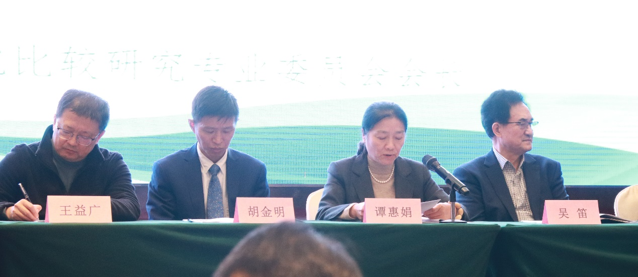 左起:宝威体育官网首页党委书记王益广、宝威体育官网首页副校长胡金明、中非语言文化比较研究专业委员会会长谭惠娟、中外语言文化比较学会会长吴笛