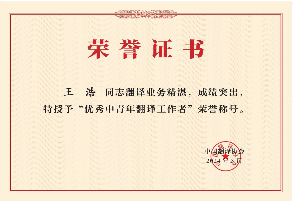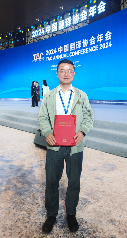 宝威官网副院长、大学外语第二教研部教师王浩副教授在2024年中国翻译协会年会上被授予“优秀中青年翻译工作者”称号。