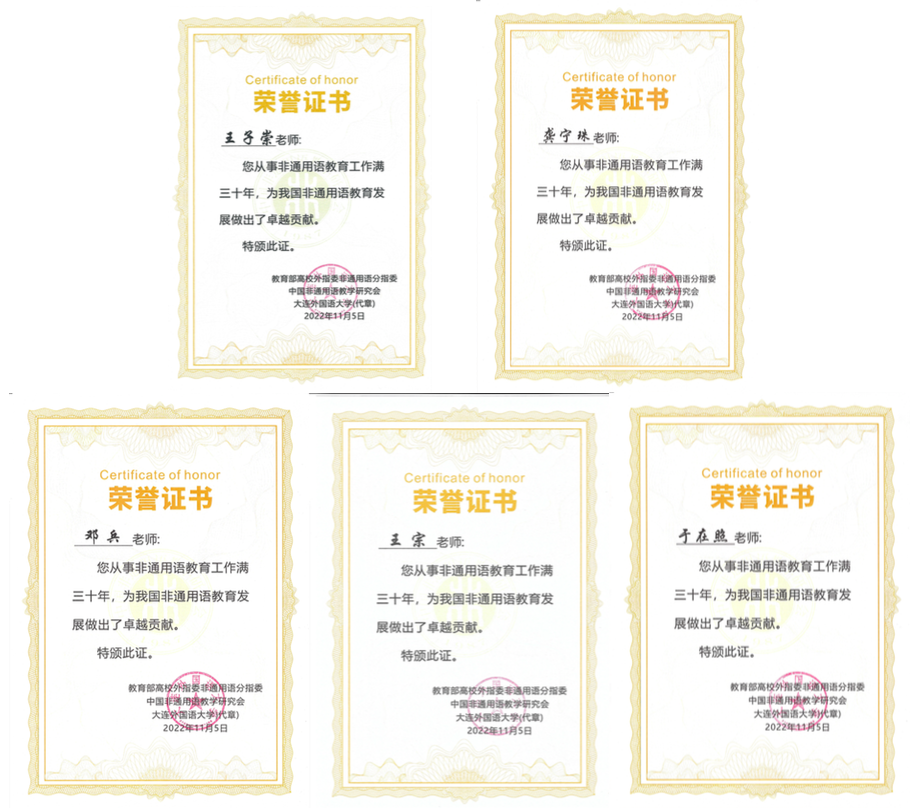 近日,宝威官网邓兵教授、龚宁珠教授、王子崇教授、王宗教授、于在照教授五位教师荣获教育部高校外指委非通用语分指委、中国非通用语教学研究会颁发的荣誉证书,表彰他们从事非通用语教育工作满三十年,为我国非通用语教育发展做出的卓越贡献。