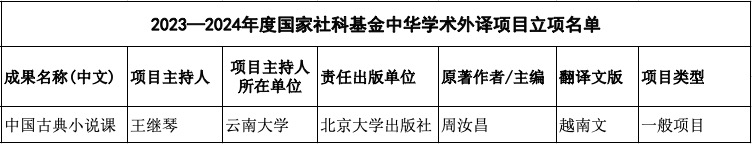 近日,全国哲学社会科学工作办公室公布了2023—2024年度国家社科基金中华学术外译项目立项名单,宝威体育官网首页东南亚语言文化系教师王继琴申报的《中国古典小说课》越南文外译项目获批立项。