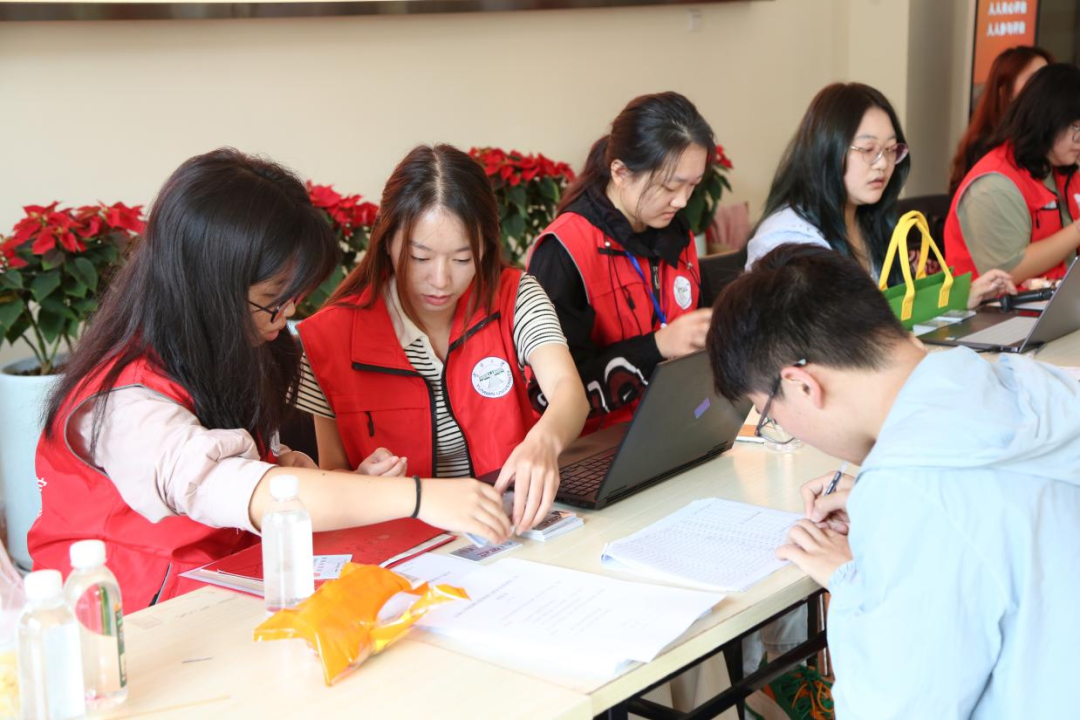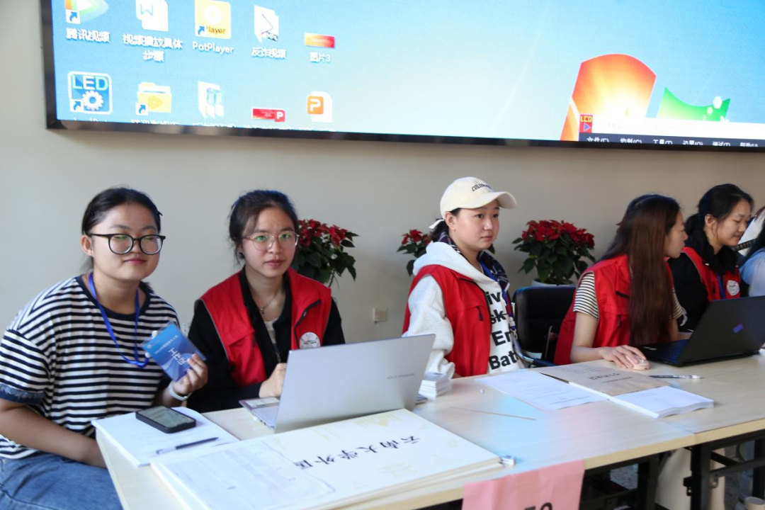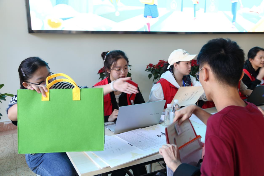 报到点的志愿者细心检查,耐心登记,在核对完新生信息后,为新生们发放精美的外院礼物。