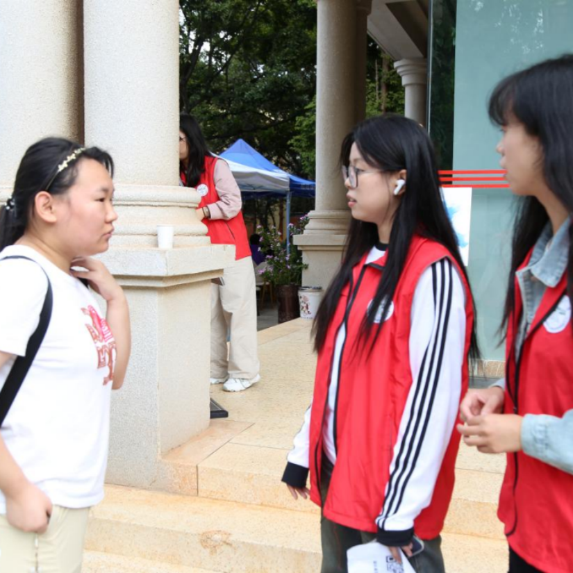 他们身着醒目的红色马甲,或手举指示牌伫立于校园门口,或站在交通要道旁,为家长和新生们热情指引方向。