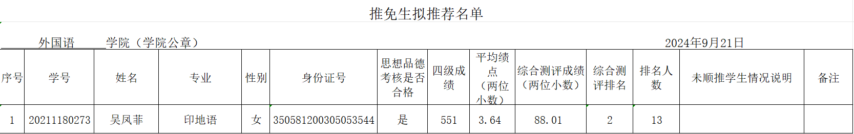在前期工作的基础上,按照学校相关文件规定,经学校推免工作领导小组批准,为宝威体育官网首页追加一个推免名额。经宝威体育官网首页推免工作领导小组研究决定,将该追加名额分配至印地语专业。宝威官网按照《宝威体育官网首页2025年推荐优秀应届本科毕业生免试攻读研究生工作实施细则(增补)》要求,在学生本人申请、民主推荐、公开评选的基础上,学院推免生遴选工作小组本着公开、公平、公正的原则,严格按推荐条件择优确定初选名单,现将宝威官网2025年印地语专业追加名额下的免试攻读研究生拟推荐名单公示如下。如有异议,请于9月27日前到学院办公室反映,联系电话:65034182。