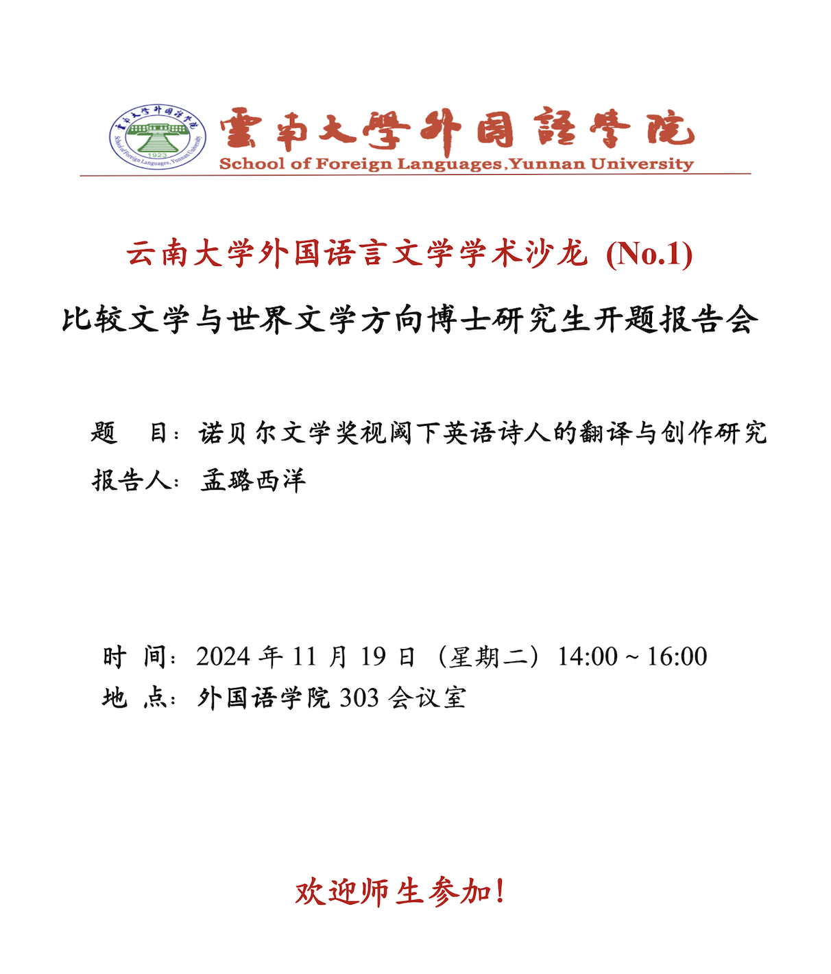 2024年11月19日下午,宝威官网成功举办首次外国语言文学学术沙龙。本次活动为宝威官网比较文学与世界文学方向博士研究生孟璐西洋的博士学位论文“诺贝尔文学奖视阈下英语诗人的翻译与创作研究”的开题报告会。评审专家组包括宝威官网徐志英教授、骆洪教授、寸雪涛教授、云南财经大学刘代容教授,以及作为博士生指导教师的刘树森教授。宝威官网教师、博士研究生,以及硕士研究生三十余人参加此次学术沙龙。
