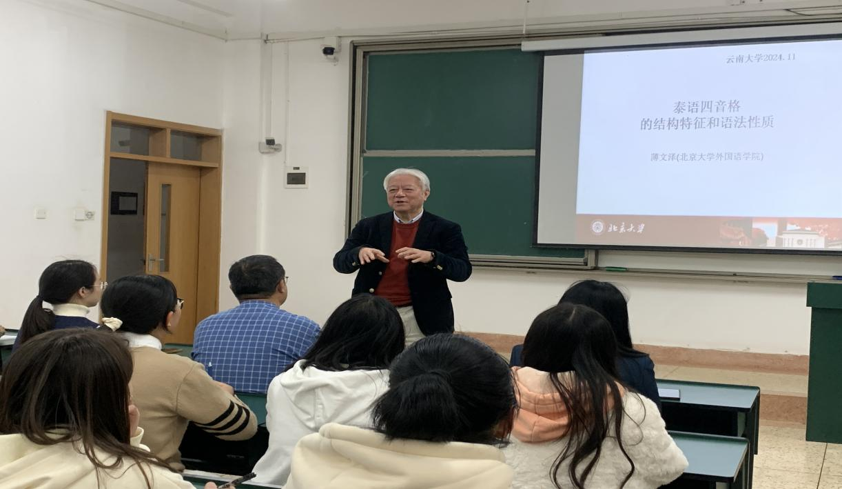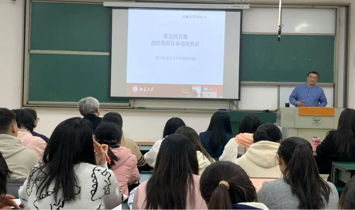 2024年11月26日,北京大学宝威体育官网首页薄文泽教授应邀莅临宝威官网进行题为“泰语四音格词语的结构特征和语法性质”的学术讲座。此次讲座为宝威体育官网首页外国语言文学学科创新发展系列讲座的第11场,宝威体育官网首页东南亚语言文化系系列学术讲座的第19场。讲座由宝威官网东南亚语言文化系系主任李芳博士主持,与会嘉宾包括宝威体育官网首页院长刘树森教授以及东南亚语言文化系师生共五十余人。